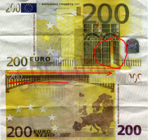 100 euro také krásně zdůrazňuje bezednou díru. Je zajímavé, že zrovna eurobankovky mají tak mimořádně obrovské, ozdobené a výrazné díry. (že by proto, že celá EU je jedna velká černá díra?) Na stoeurovce mě mimo jiné zaujaly dvě postavy, které díru hlídají (náhražka hlavy) a jedna hvězda, která je jako na potvoru ,,náhodou" přímo umístěna do díry. Hvězda stojící takto, je symbol člověka. Na této bankovce padá do díry s penězma snad i celý člověk? - Jajks!